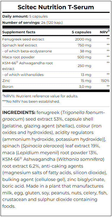 T-Serum е създаден да подпомага хормоналния баланс, да поддържа издръжливостта и мускулния тонус, както и да повишава енергията и либидото. Формулата включва адаптогени за устойчивост при стрес и е обогатена с цинк и бор за допълнително репродуктивно здраве, което я прави атрактивна за целенасочени тренировки и възстановяване.