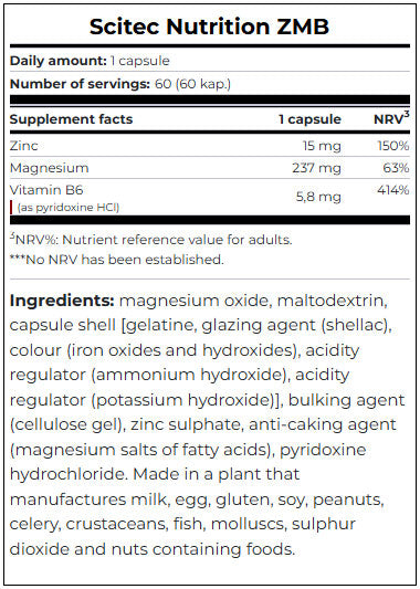 Една доза е 2 капсули. Дози в опаковка: 30. Интензивната тренировка, неподходящият хранителен режим и екологичните фактори могат да увеличат риска от дефицит на тези ключови нутриенти. Комбинацията в ZMB подпомага борбата с този дефицит, оптимизирайки нивата на анаболния хормон, възстановяването и качеството на съня. Съставки: цинк, магнезий, витамин B6. Забележки: Пазете далеч от деца! Съхранявайте на сухо и хладно място!