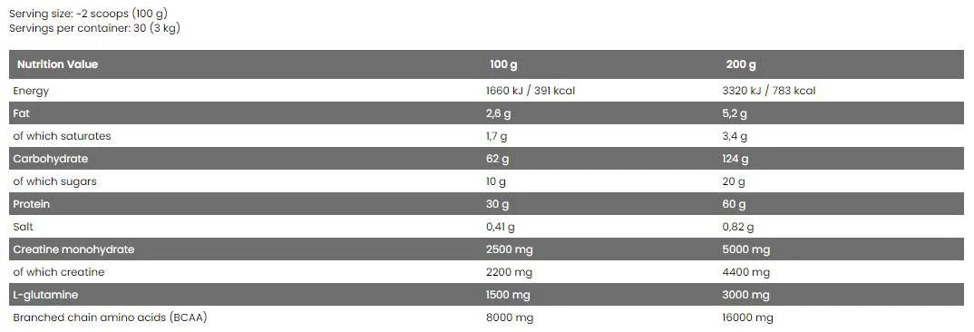 Each serving contains 2.5g of Creatine Monohydrate, which is extremely important for increasing strength and muscle mass, especially in difficult lifts. The low sugar content helps to avoid a sharp increase in insulin, which minimizes the risk of fat accumulation. Instead, the sugars in the product support the absorption of creatine, which leads to better results.