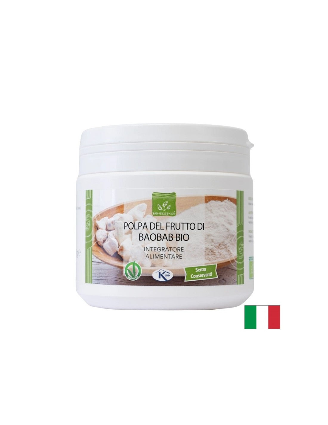Баобаб (пулпа от плод) е хранителна добавка, която съдържа органична пулпа на прах от плодовете на дървото Баобаб (които са с големина на кокосов орех и твърда черупка), получена чрез естествен процес на сушене. Богата е на фибри, пектин, липиди и аскорбинова киселина, както и на желязо, калций, мед и цинк. Помага при нередовни изхождания и запек, стимулира перисталтиката и оказва положителен ефект върху храносмилателната система и стомашно-чревния тракт. Освен това допринася за регулиране нивата на лошия холестерол в кръвта, подпомага процесите в червата и насърчава заселването на добрите бактерии в организма. Благодарение на високото съдържание на калций в състава си, тази хранителна добавка оказва благоприятен ефект върху здравето на костите, ставите и зъбите и спомага за нормалното усвояване на желязото в организма. Продуктът действа тонизиращо и енергизиращо, подсилва имунната система, подобрява защитните сили на организма и помага на тялото в борбата с различни инфекции, бактерии и вируси. Има приятен леко кисел цитрусов вкус, ниско съдържание на захар и може да се използва като добавка към смутита, шейкове, различни видове кремове, енергийни барчета или закуски.