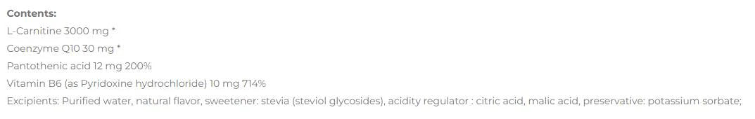 Съдържа 3000 mg L-карнитин в удобна ампула от 25 ml, подсладен със стевия за вкус без излишни калории. Л-карнитинът използва мазнините като основен източник на енергия по време на спорт, което помага за по-добра издръжливост и по-малка умора.