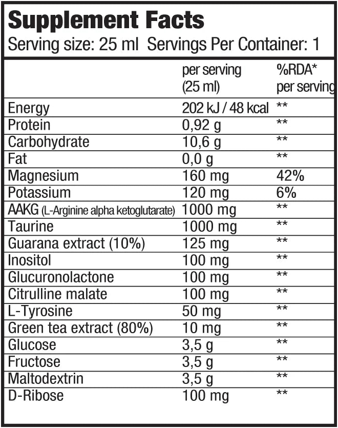 The Energy Shot formula is enriched with magnesium, which plays an important role in maintaining electrolyte balance and energy metabolism. L-arginine in the composition increases nitric oxide levels, dilates blood vessels and improves blood circulation, which is essential for the delivery of oxygen and nutrients to the muscles.