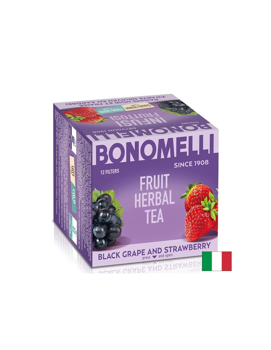 Infusion Frutosi Black Grape and Strawberry е натурална билкова смес на италианската компания Bonomelli, съдържаща екстракти от хибискус, черно грозде, ягоди, ябълка, шипка, бъз и корен от сладник. Благодарение на високото съдържание на антиоксидантни полифеноли в черното грозде и флавоноиди в ягодите, чайът защитава клетките, подкрепя функцията на имунната система и подпомага здравето на сърдечно-съдовата система. Не съдържа кофеин, ГМО и изкуствени оцветители. Съставки: Цветове от червен хибискус, ябълка, шипка, естествени аромати 10%, корен от сладник, портокалова кора, бъз (Sambucus nigra, цвят), черно грозде 2%, ягода 1%.