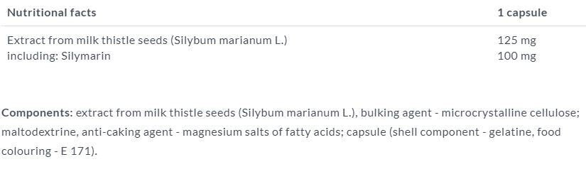 Ingredients: 60.5% milk thistle seed extract, bulking agent - microcrystalline cellulose, Anti-Caking Agent - Magensium stearate, capsule (gelatin, color E171).