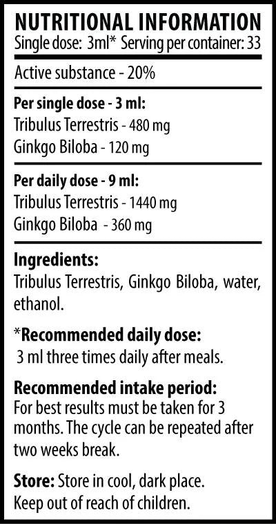 Tribulus + is a high-quality water-alcoholic extract composed of the herbs Tribulus Terrestris (Cow's Tooth) and Ginkgo Biloba (Ginkgo Biloba). This product is developed by the number one brand for liquid dietary supplements, which guarantees the maximum concentration of beneficial substances in a 100 ml package. The combination of active ingredients stimulates the production of gonadotropic hormones, which leads to an increase in testosterone levels and improvement of reproductive function.
