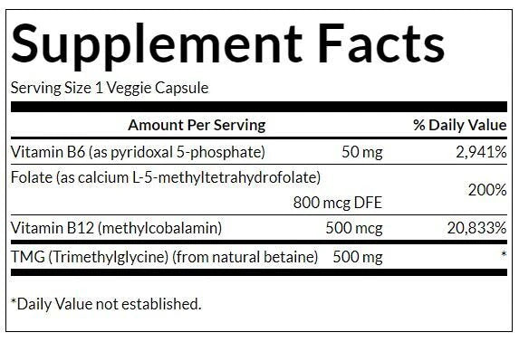 → Each capsule contains 50 mg of vitamin B6, 800 μg of folate, 500 μg of vitamin B12 and 500 mg of TMG (trimethylglycine) (from natural betaine)