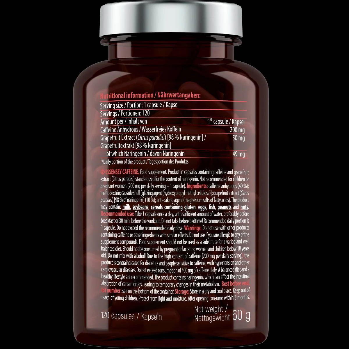 Dietary supplement in capsule form containing 200 mg of caffeine and grapefruit extract, standardized for naringenin content.