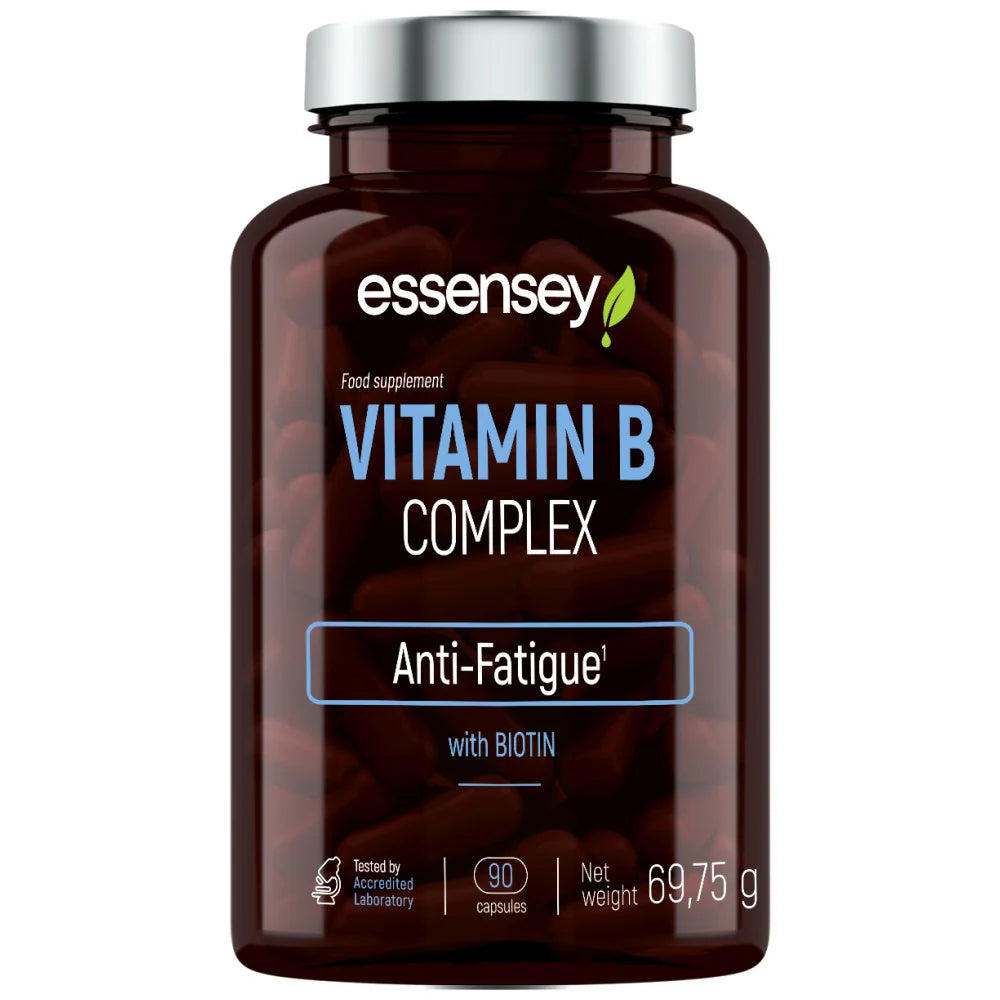 The ESSENSEY VITAMIN B COMPLEX food supplement contains vitamins B6 and B12, which contribute to reducing the feeling of fatigue and supporting metabolism.