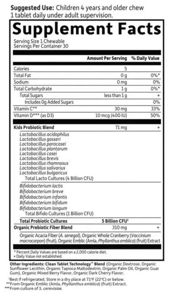 Dr. Formulated Probiotics Organic Kids+ is a unique USDA certified, Non-GMO Project Verified, organic, delicious chewable probiotic specifically for kids, offering immune system and digestive support.