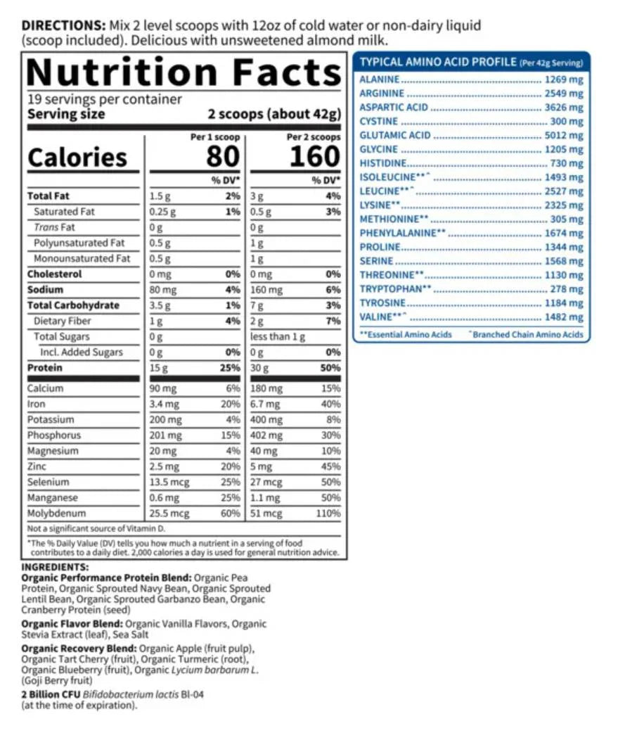 Organic Plant-Based Protein offers a blend of certified organic proteins from a variety of sources, including organic peas grown in the USA to give it a great smooth and creamy texture. Then we added other quality proteins like organic garbanzo beans, organic navy beans, organic lentils and organic cranberry seed protein. One serving delivers 300g of complete protein, providing a complete profile of all essential amino acids, 5.5g of BCAAs and 5g of glutamine, which are important for reducing recovery time after training. There are no synthetic branched chain amino acids - they all come from organic ingredients.