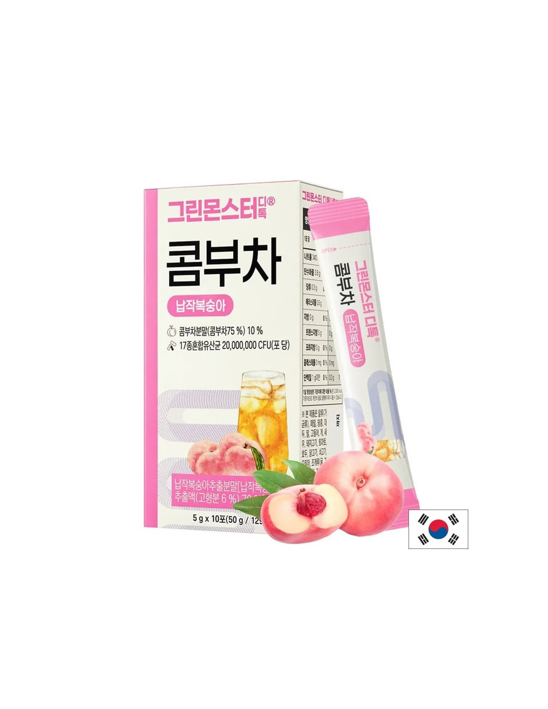 Ingredients: Anhydrous citric acid, sodium carbonate, organic kombucha powder (fermented green tea - Germany) - 70%, organic maltodextrin - 30%, kombucha powder - 10%, flat peach extract powder (flat peach extract with solids content 6% - 70%) - 7%, dextrin, aroma (peach), strawberry powder, enzyme-processed stevia, red ginseng powder (Germany), fructooligosaccharide powder, calcium lactate, isomaltulose, glycine, probiotic Limosilactobacillus fermentum, carambola (star fruit) juice powder.