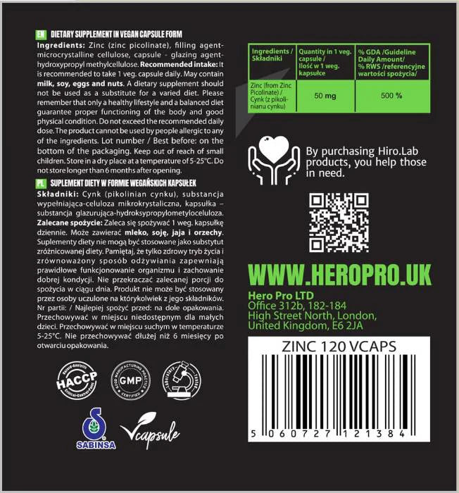 Цинков пиколинат 50 mg – 120 капсули е висококачествена хранителна добавка от Hero.Lab, създадена за лесно включване в ежедневния режим. Формулата използва популярна форма на цинк, която се асимилира добре от организма. Опаковката от 120 капсули предлага дълготрайна поддръжка в рамките на дневната доза, без да усложнява приема.