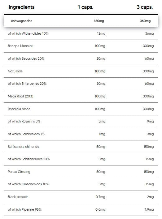 Capsule composition: cellulose, ashwagandha extract (Withania Somnifera; of which 10% withanolides), Bacopa Monnieri extract (of which 20% bacosides), gotu kola extract (Centella asiatica; of which 20% triterpenes), maca root extract (20:1), Rhodiola rosea extract (of which 3% Rosavins, 1% Salidrosides), Schisandra chinensis extract (of which 10% Schizandrines), Panax Ginseng extract (Panax ginseng CA Meyer; of which 10% Ginsenoisdes), black pepper extract (Piper Nigrum; of which 95% piperine).