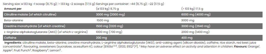 Mix 2 scoops with 250 ml of water. Drink it all at once 20 minutes before training.