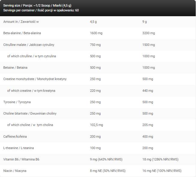 In one dose you will find high levels of beta alanine, citrulline malate and caffeine, as well as many other substances.