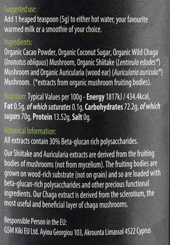 KIKI Health Organic Cocoa with Mushrooms is a functional drink combining 100% organic cocoa powder with extracts from the fruiting bodies of three adaptogenic mushrooms: Shiitake, Chaga and Auricularia (wood ear). These mushrooms are known for their beneficial effects on the immune system, cognitive function and general well-being. The product is suitable for vegans and vegetarians, and is free of gluten, GMOs, artificial additives or fillers.