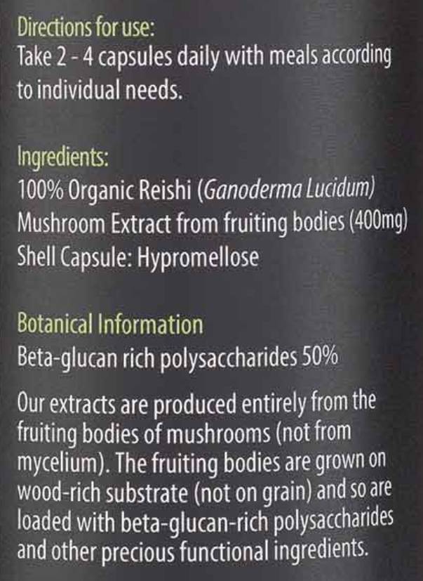 This product contains 100% organic extract of Reishi fruit bodies grown on a wood substrate (Duanwood), which guarantees a high concentration of bioactive compounds. An enzymatic, temperature-controlled double extraction is used, ensuring the full spectrum of beneficial substances. The extract is standardized to 50% beta-glucan polysaccharides and contains a significant amount of triterpenes and polyphenols. It does not contain mycelium, cereals, starch or additives.