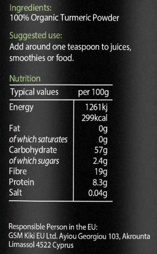 KIKI Health Organic Turmeric Powder е висококачествена хранителна добавка, произведена от 100% органична куркума (Curcuma longa), отглеждана в Северна Индия. Продуктът е сертифициран от UK Soil Association, което гарантира неговата чистота и качество. Прахът е суров, без добавки, пълнители или изкуствени съставки, и съдържа минимум 2% куркумин – активното съединение, известно със своите антиоксидантни и противовъзпалителни свойства.