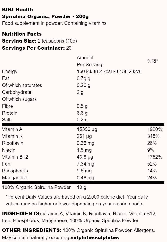 KIKI Health Spirulina Organic Powder is 100% pure , organically grown spirulina powder, produced without additives, fillers or preservatives. This blue-green microalgae is known for its rich nutritional profile, including high levels of plant protein, vitamins and minerals. KIKI Health's spirulina is grown in an ecologically clean environment, away from pollution and urban areas, which guarantees its purity and high quality.