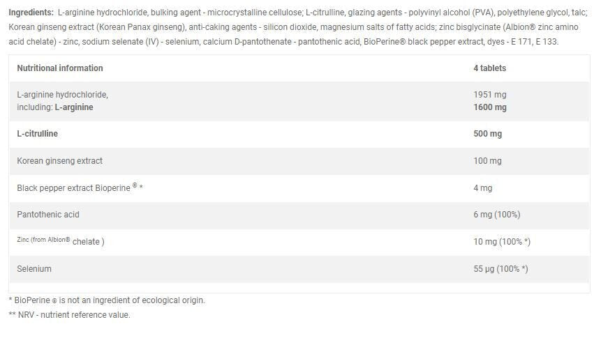 Ingredients: L-arginine hydrochloride, filler – microcrystalline cellulose, L-citrulline malate, glazing agents – polyvinyl alcohol, polyethylene glycol, talc; Korean ginseng extract (Korean Panax ginseng), anti-caking agents – silicon dioxide, magnesium salts of fatty acids; zinc bisglycinate (Albion® zinc amino acid chelate), sodium selenite (IV); calcium D-pantothenate (pantothenic acid), coloring agents: E 171, E 133