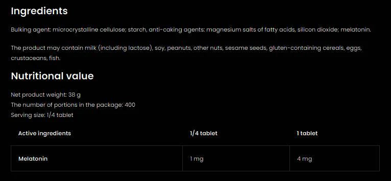 Melatonin is a hormone that is naturally produced in the body and plays an important role in regulating sleep. Taking a melatonin supplement can help restore normal sleep rhythms, especially in stressful situations or when changing time zones. The product contains 4 mg of melatonin per tablet, which helps you fall asleep faster and improves the quality of sleep, which is essential for overall health and good mental state.