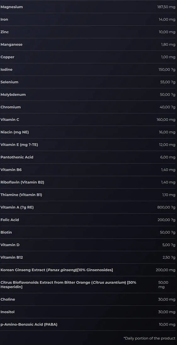 COMPOSITION: Essential Mineral Complex [magnesium oxide; magnesium carbonate; ferrous fumarate; maltodextrins; zinc sulfate; manganese sulfate; copper sulfate; potassium iodide; chromium chloride; sodium molybdate; sodium selenate]; Metabolic Enhancers [Korean Ginseng Extract (Panax ginseng) [10% ginsenosides]; Citrus Bioflavonoid Extract from Bitter Orange (Citrus aurantium) [50% hesperidin]; Choline Bitartrate; Inositol; p-aminobenzoic acid (PABA)]; Vitamin Formula [vit. C (L-ascorbic acid); niacin (nicotinamide); vit. E (DL-alpha-tocopheryl acetate); pantothenic acid (calcium D-pantothenate); vit. B6 (pyridoxine hydrochloride); riboflavin; thiamine (thiamine mononitrate); vit. A (retinyl acetate); folic acid (pteroylmonoglutamic acid); biotin (D-biotin); vit. D (cholecalciferol); vit. B12 (cyanocobalamin)]; capsule shell (gelatin; colors – titanium dioxide, iron oxides and hydroxides, patent blue V); anti-caking agent – magnesium salts of fatty acids.