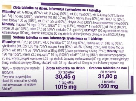 The composition combines fat- and water-soluble vitamins (including the complete vitamin B complex) and minerals: iron (amino acid chelate Albion®), magnesium, chromium, selenium, manganese (amino acid chelate Albion®), iodine, molybdenum.