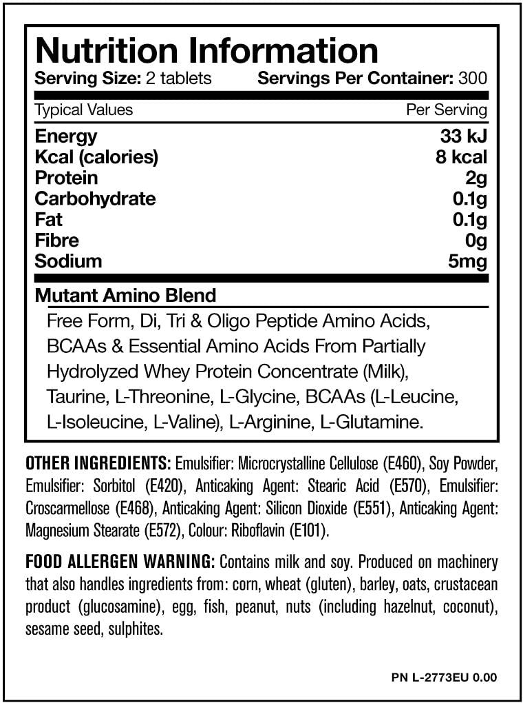 Една доза съдържа 2000 мг качествени аминокиселини, които помагат за възстановяването след натоварвания и за предотвратяване на мускулния разпад. Amino от Mutant допринася за поддържането на анаболния режим на организма и може да подпомогне изграждането на чиста мускулна маса с редовна суплементация.