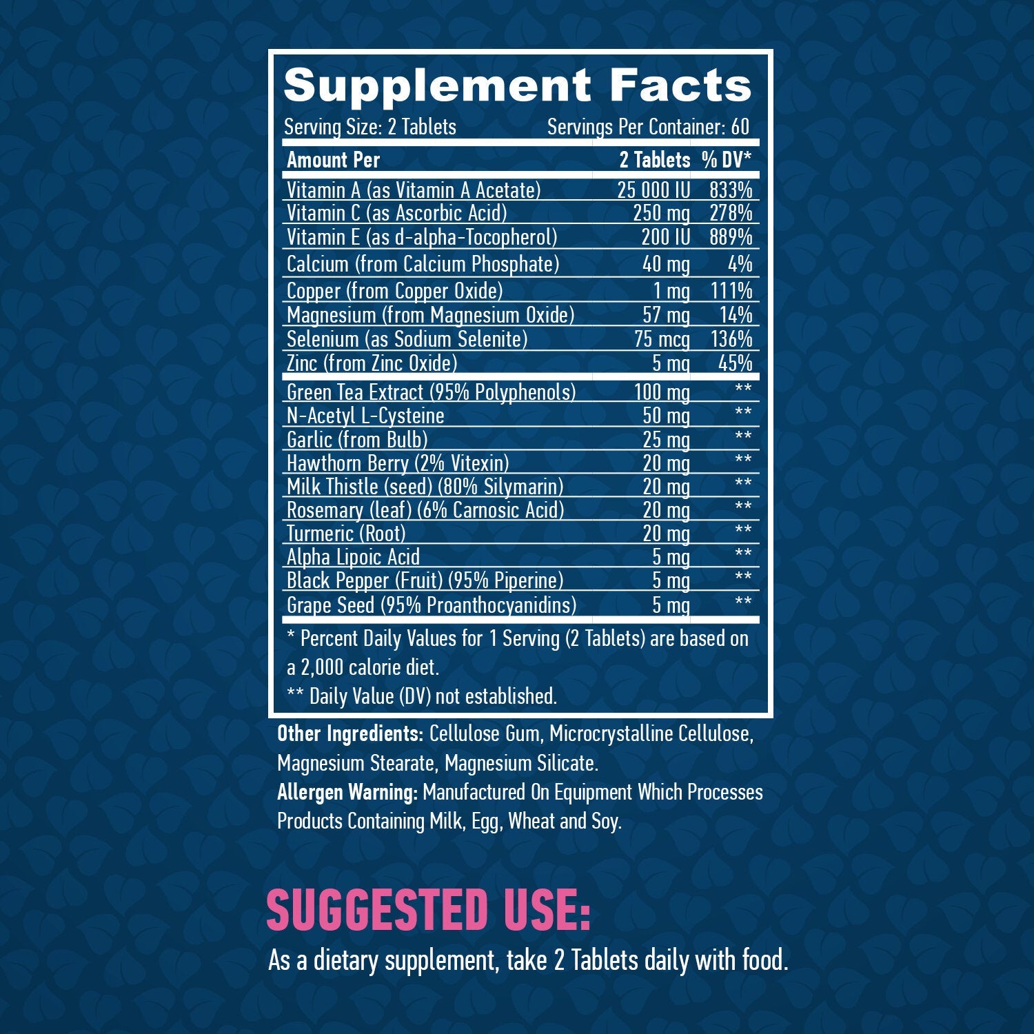 The formula includes beta-carotene, selenium and N-acetyl cysteine, which are considered essential ingredients for maintaining the body's health. Vitamins A, C and E, as well as plant extracts of green tea, turmeric and milk thistle, provide powerful protection against oxidative stress. Studies show that these ingredients can reduce the risk of chronic diseases and enhance the immune response.