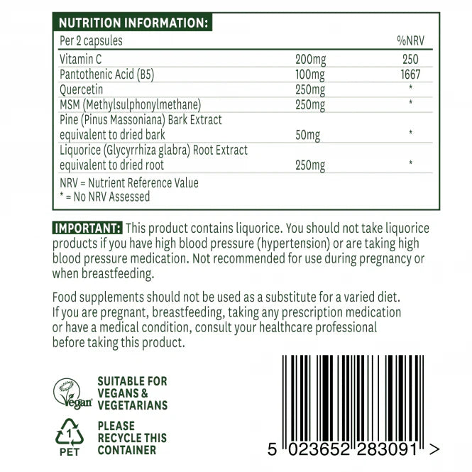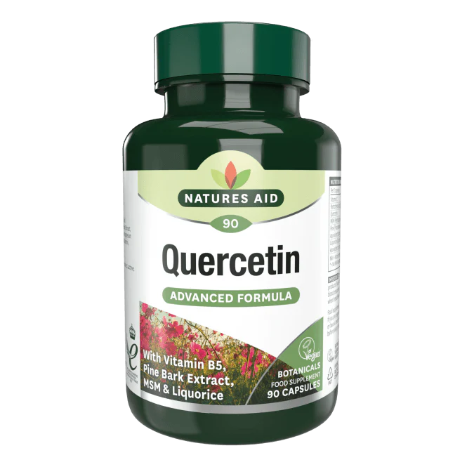 Natures Aid Quercetin Formula with quercetin, vitamin C, vitamin B5 (pantothenic acid), MSM (methylsulfonylmethane), pine bark extract and licorice root extract (licorice).