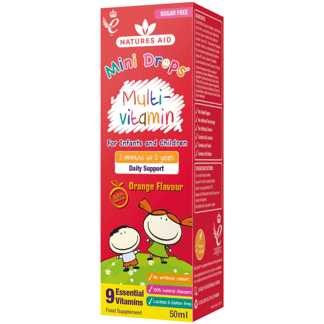 Natures Aid Mini Drops Multi-vitamin contain nine vital vitamins, specially selected to support the well-being of young children. While we all try hard to provide the optimal, healthiest daily nutrition for our children, it can be a challenge to keep up with their nutritional needs as they grow and as their personal preferences change over time. That’s where multivitamin drops come in! Mini Drops Multivitamin Drops give you the peace of mind that comes with knowing you’re providing your child with the nutrients they need. Mini Drops Multivitamin Liquid Supplement contains a carefully balanced combination of 9 vitamins, specifically designed to support the everyday health and development of children aged three months to five years. With a natural, sugar-free orange flavour, these hassle-free multivitamin drops deliver vitamins A, B, C and D to help support your child’s health from the inside out.