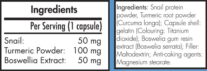 Как работи: екстрактът от охлюв предлага високо съдържание на алантоин, който подпомага хидратацията на хрущяла и намалява оттоците. Куркумата допринася с противовъзпалителни свойства, докато босвелия подпомага поддържането на еластичността и подвижността на ставите. Една доза е 1 капсула, което улеснява редовния прием и осигурява удобство за ежедневието.