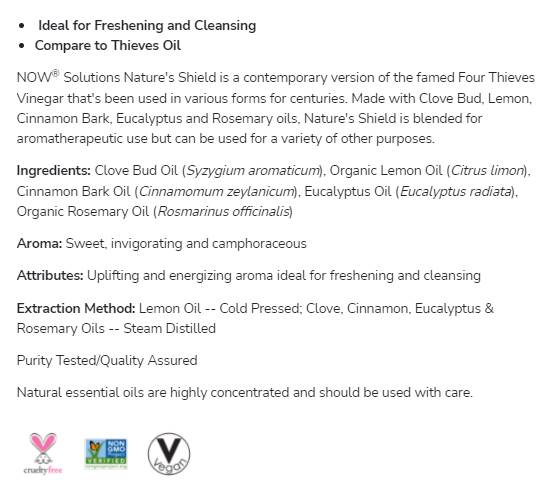 NOW® Solutions Nature's Shield is a modern version of the famous Four Thieves vinegar, which has been used in various forms for centuries. Made with oils of clove, lemon, cinnamon bark, eucalyptus, and rosemary, Nature's Shield is blended for aromatherapy use, but can also be used for a variety of other purposes.