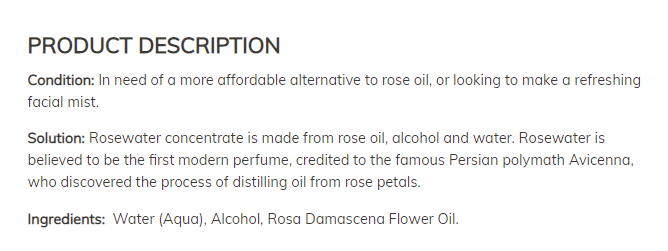 - Ingredients: Water (Aqua), Alcohol, Rosa Damascena Flower Oil.