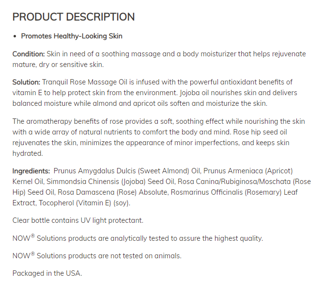 Solution: Calming rose massage oil is infused with the powerful antioxidant properties of vitamin E to protect skin from the environment. Jojoba oil nourishes skin and provides balanced moisture, while almond and apricot oils soften and moisturize the skin.