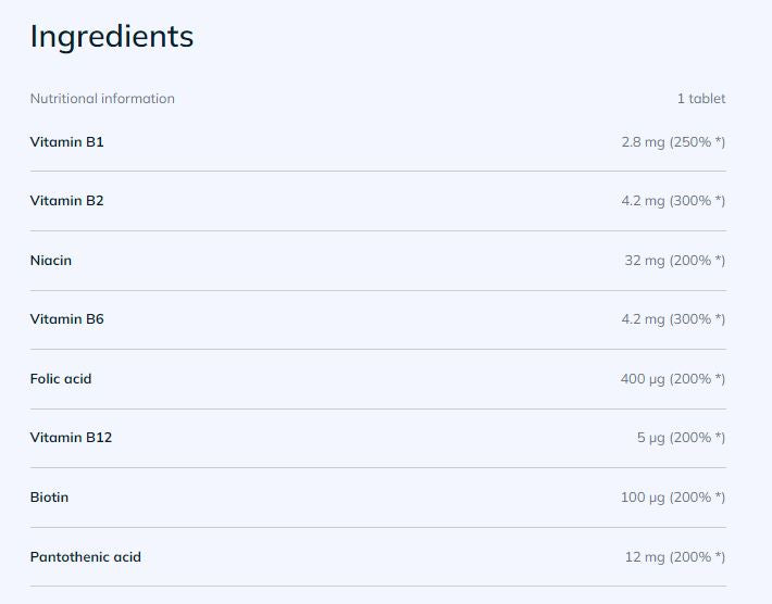 Формулата съдържа пълен комплект витамини от група B (B1, B2, B3, B6, B9, B12) и биотин, които участват в енергийната продукция, поддържат нервната система и подпомагат синтеза на протеин. В комбинация те подпомагат нормалното функциониране на организма и допринасят за здравето на кожата, косата и ноктите, като осигуряват необходимата дневна доза от жизненоважни нутриенти.
