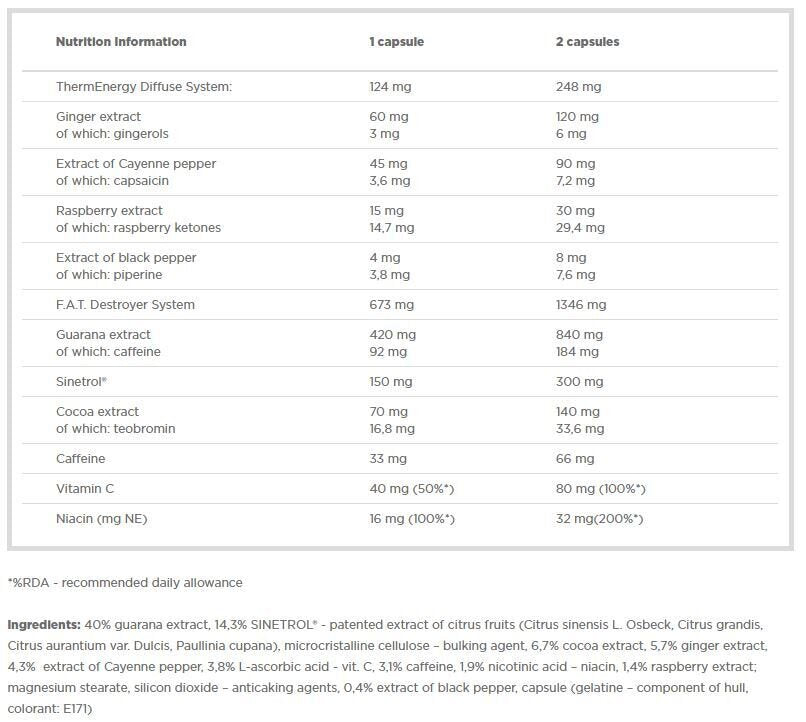 Ingredients : 40% guarana extract, 14.3% SINETROL® - patented citrus fruit extract (Citrus Sinensis L. Osbeck, Citrus Grandis, Citrus Aurantium Var, Paullinia cupana.), Microcrystalline cellulose - filler, 6.7% cocoa extract, 5.7% ginger extract, 4.3% Cayenne pepper extract, 3.8% L-ascorbic acid - vit. C, 3.1% caffeine, 1.9% nicotinic acid - niacin, 1.4% raspberry extract; magnesium stearate, silicon dioxide - anti-caking agents, 0.4% black pepper extract, capsule (gelatin - shell component, colorant: E171)