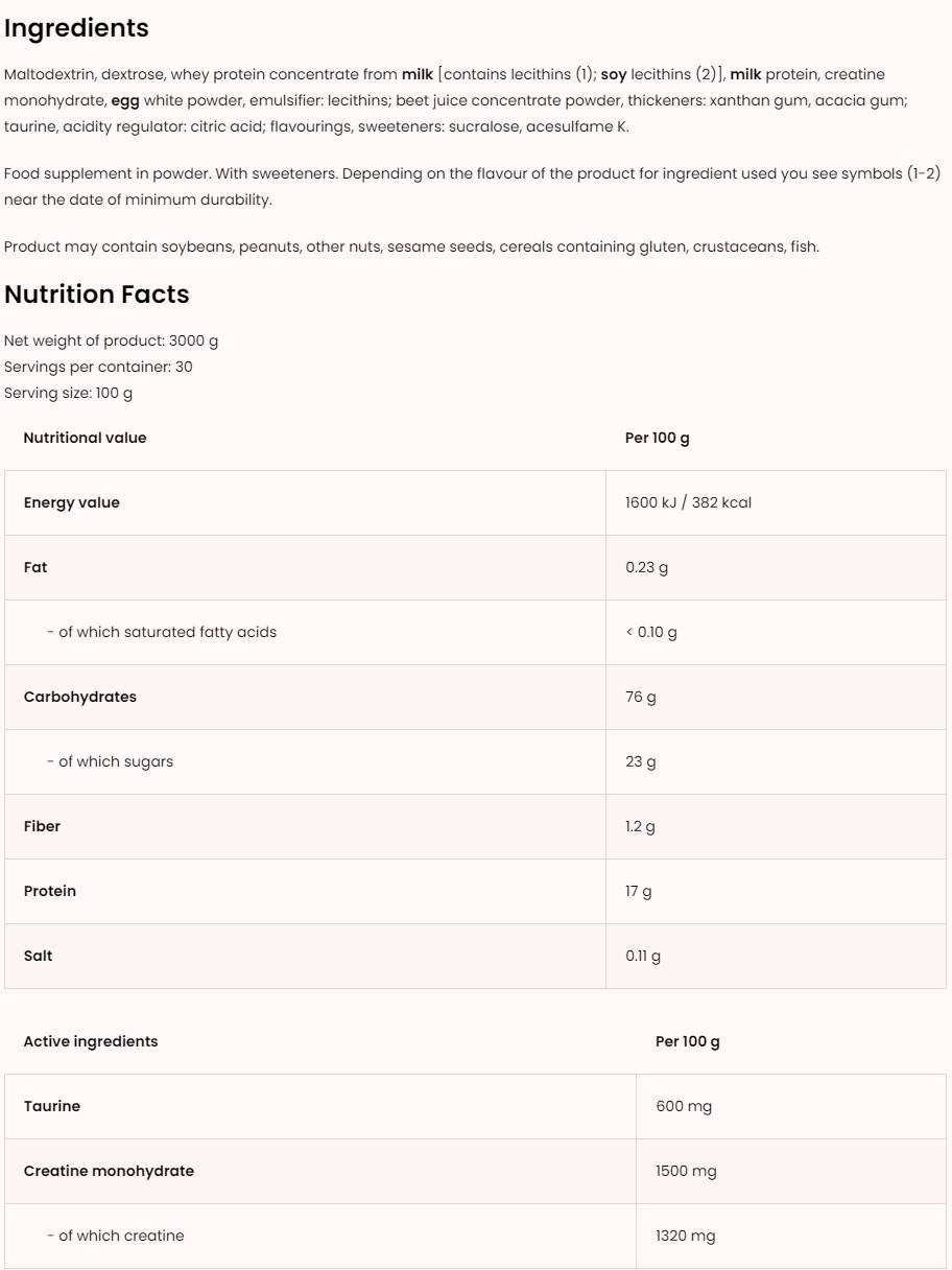 The High Carb ~ Low Fat Gainer is specially designed for those who want to increase their muscle mass and energy reserves. With its high carbohydrate content, it provides the necessary energy for intense workouts, which helps to recover faster and achieve better results. Thanks to its low fat content, the product is perfect for athletes who want to stay in good shape while building muscle.