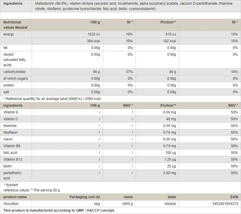 Maltodextrin Glycemic index 115 Low osmolarity Massive insulin modulation More energy Ideal transporter Vitamin complex GLUCOFAST is a medium-molecular carbohydrate hydrolysate and is mainly used in endurance sports as an energy supplier.