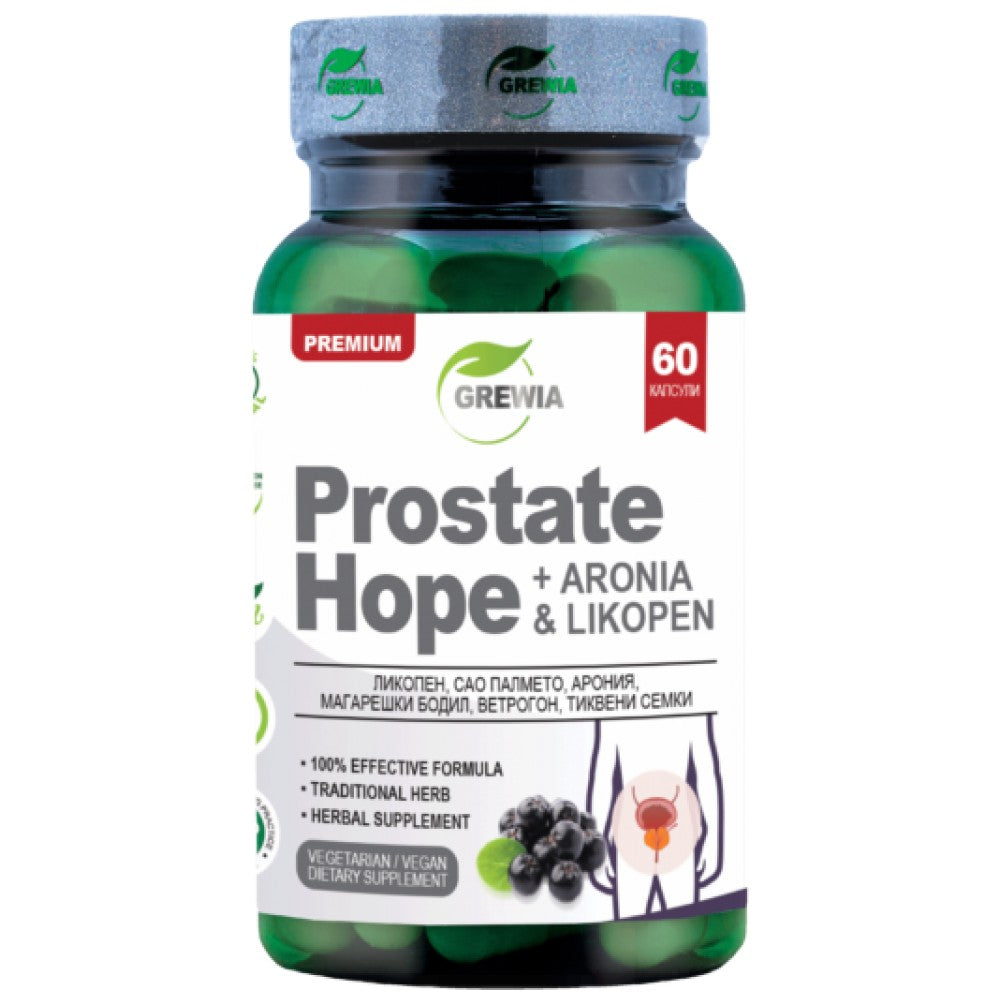 ПРОСТАТХОУП + АРОНИЯ & ЛИКОПЕН е продукт от най-новото поколение с марката Grewia. Той представлява хранителна добавка в 60бр.растителни/веган/ капсули, в чиято 100% иновативна и ефективна формула, в състав от високо стандартизирани билкови екстракти от Ликопен/Lycopene-5%/, Сао Палмето/Serenoa Repens–45% GC/, Арония/Aronia melanocarpa-80%/, Магарешки бодил /Onopordum Acanthium 80%/, Ветрогон/Биволски трън /Eryngium campestre-90% / и Тиквени семки/ Cucurbita pepo-100% Natural/ , с основната цел, – оптимално функциониране на простатната жлеза и превенция на нейното доброкачествено уголемяване, за нормален синтез на тестостерона и стимулиране производството на надбъбречни хормони, – за подсилване на сперматогенезата и подобряване половата функция, както и нормалното функциониране на пикочните пътища и бъбреците.