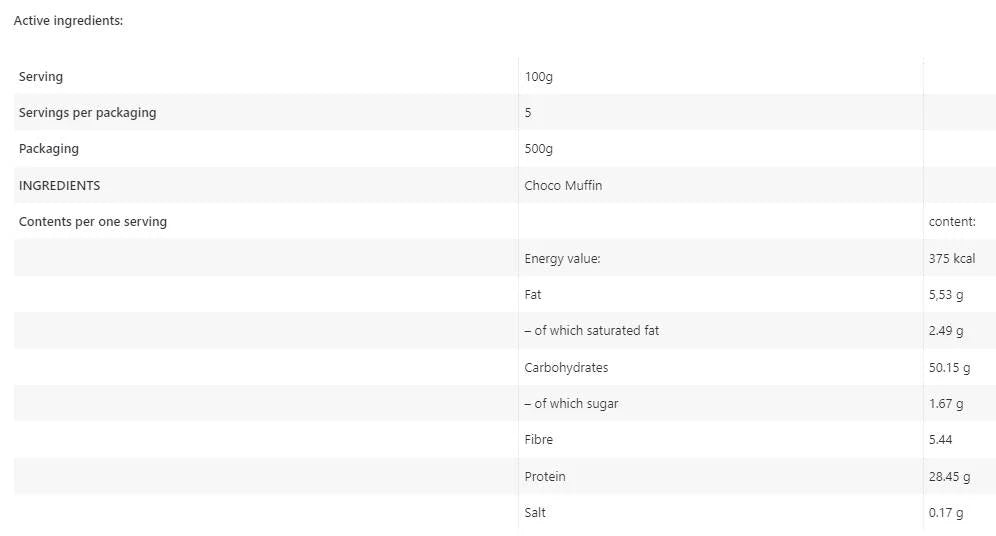 The high-protein chocolate muffin is a perfect choice for anyone looking to increase their daily protein intake in a delicious way. This product is ideal for both active athletes and people who simply want to stay fit and healthy. The high protein content helps build muscle and aid recovery after exercise, while offering the pleasure of chocolate flavor.