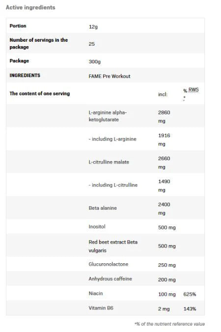 Fame Pre Workout by SFD is a cutting-edge nutritional supplement designed to revolutionize your workout experience. This innovative blend combines arginine, citrulline, beta-alanine, beetroot extract and inositol, all carefully selected for their synergistic effects on exercise performance.
