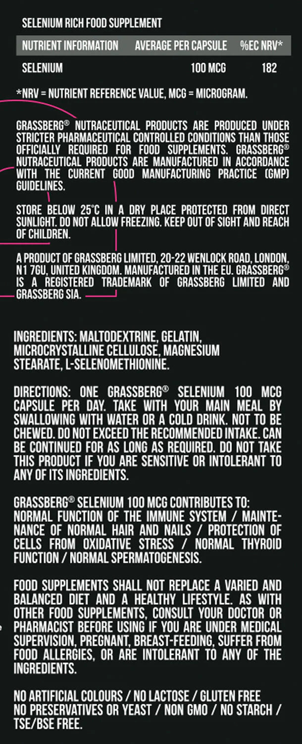GRASSBERG Selenium 100mcg protects cells from oxidative stress by strengthening the immune system, while reducing free radical damage. The product helps protect the body from a number of viral diseases.