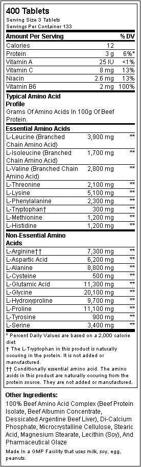 Съставът съдържа аминокиселини, извлечени от висококачествен говежди протеин изолат, говежди албумин концентрат и черен дроб от аржентински говеда. Всяка таблетка предоставя важни нутриенти за поддържане на мускулната тъкан, ускоряване на възстановяването и подобряване на общия тонус. Приемът преди хранене допълнително увеличава дневния прием на аминокиселини и подпомага анаболния потенциал на организма.