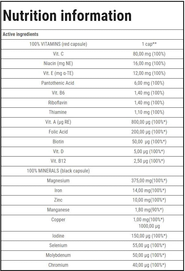 100% VITAMINS & MINERALS . Food supplement. COMPLETE VITAMINS & MINERALS FORMULA FOR ATHLETES. 100% VITAMINS & MINERALS is a product that consists of 2 capsules: 100% VITAMINS (red day capsule) and 100% MINERALS (black night capsule). The product contains essential B vitamins, including thiamine, vitamin B6, riboflavin and vitamin B12, which play a major role in energy metabolism and support the function of the nervous system. The product contains vitamins A, C and D, which strengthen the immune system, and vitamin E, which protects cells from oxidative stress. The magnesium contained in the product reduces tiredness and fatigue, while iodine and selenium ensure a healthy thyroid gland. The product is a source of zinc, an important mineral for men, which helps maintain adequate testosterone levels in the blood.