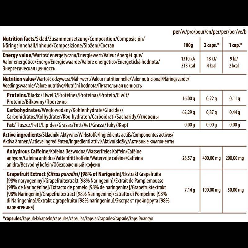 Caffeine 200 Plus contains a large amount of grapefruit extract , standardized to 98% naringenin , which improves the effectiveness of caffeine supplements. The ingredient gives citrus fruits their characteristic bitter taste, but it also has other interesting properties. Scientific studies have shown that taken orally in combination with caffeine , naringenin increases caffeine levels in the blood by 28% and prolongs its activity in the body by almost 30%, as a result of a specific metabolic reaction. Naringenin also acts as a thermogenic and, together with caffeine, activates fat metabolism. As a result, their subcutaneous accumulation is limited and the amount of available energy is increased.