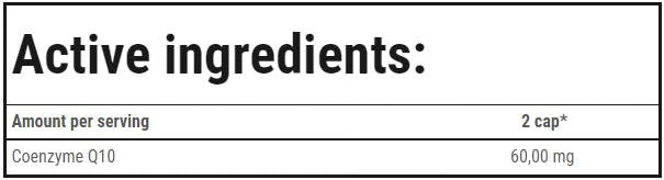COMPOSITION: maltodextrin; capsule shell (gelatin; color – titanium dioxide); coenzyme Q10 (6.0%); anti-caking agent – ​​magnesium salts of fatty acids.