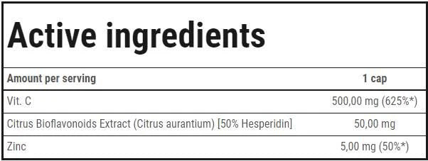 In addition to the highly effective dosage of ascorbic acid, the product is enriched with lemon bioflavonoids and zinc oxide.