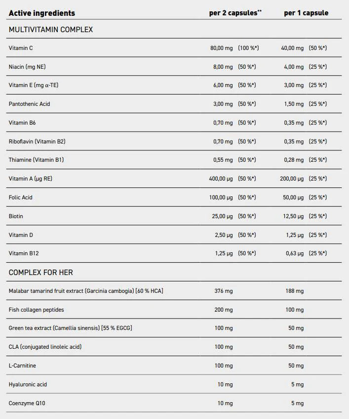 → Added nutritional value: Multivitamin complex for women is enriched with fruit extracts of Malabar tamarind and green tea, fish collagen peptides, CLA, L-carnitine, hyaluronic acid and coenzyme Q10. These additional ingredients offer the following benefits: