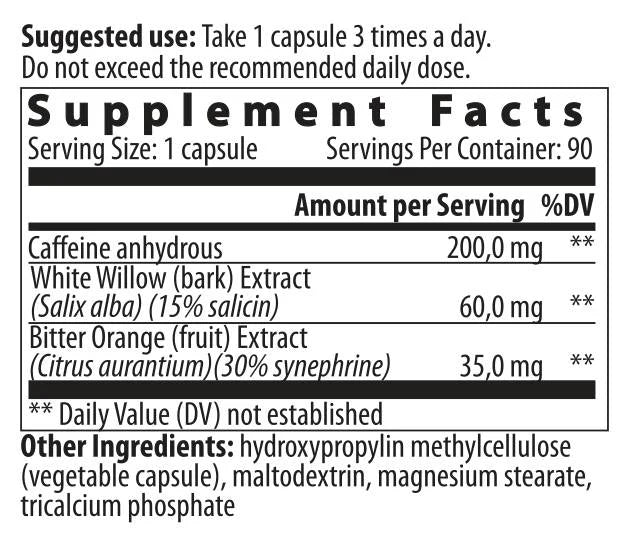 VemoHerb® ECA food supplement contains : 200.0 mg Caffeine anhydrous, 35.0 mg dry extract of Citrus aurantium (bergamot), standardized for synephrine, not less than 30.0%, 60.0 mg dry extract of White Willow bark, standardized for salicin, not less than 15% and 135.0 mg fillers: maltodextrin, microcrystalline cellulose and magnesium stearate.